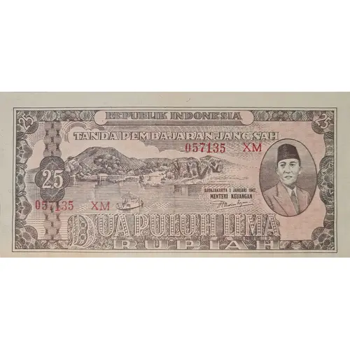 Obverse lettering REPUBLIC INDONESIA TANDA PEMBAJARAN JANG SAH DUA PULUH LIMA RUPIAH