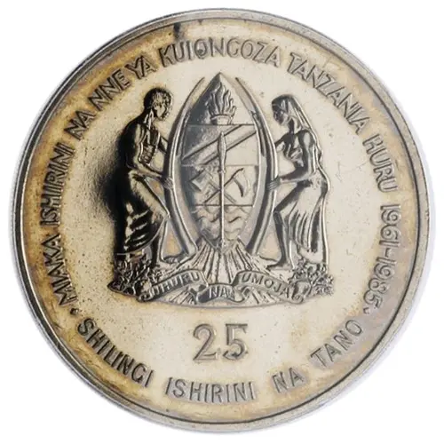 | Obverse lettering | · MIAKA ISHIRINI NA NNE YA KUIONGOZA TANZANIA HURU 1961-1985 · 25 SHILINGI ISHIRINI MBILI NA TANO |