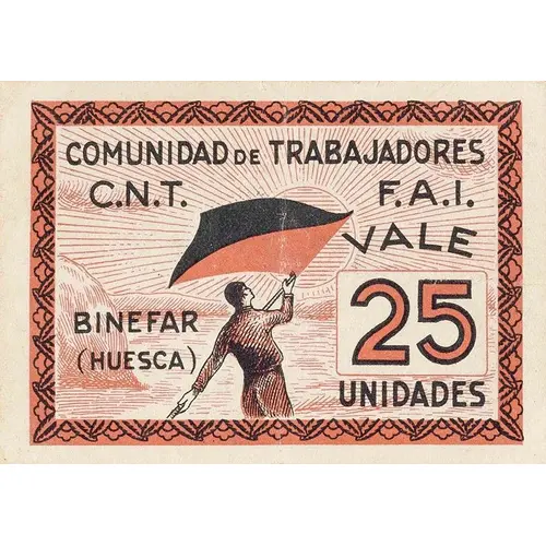 表面の銘文 COMUNIDAD DE TRABAJADORES C. N. T. F. A. I. BINEFAR (HUESCA) VALE 25 UNIDADES
