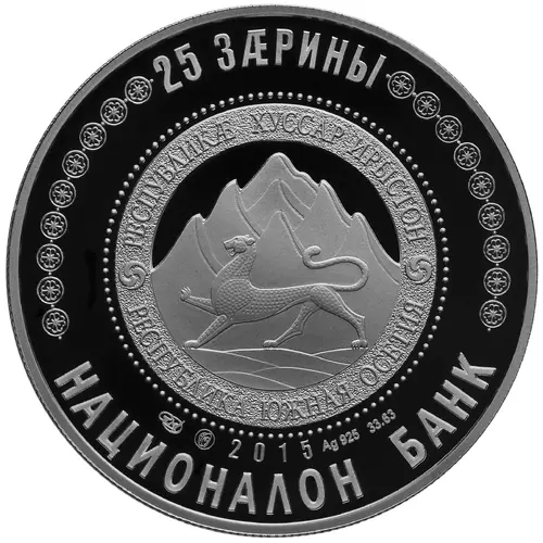 25 ЗÆРИНЫ РЕСПУБЛИКӔ ХУССАР ИРЫСТОН РЕСПУБЛИКА ЮЖНАЯ ОСЕТИЯ СПМД 2015 Ag 925 33.63 НАЦИОНАЛОН БАНК (Translation: 25 Zarin Republic of South Ossetia SPMD 2015 Ag 925 33.63 National Bank) |