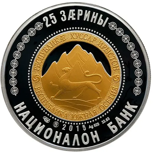 | Obverse lettering | 25 ЗÆРИНЫ РЕСПУБЛИКӔ ХУССАР ИРЫСТОН РЕСПУБЛИКА ЮЖНАЯ ОСЕТИЯ СПМД 2015 Ag 925 33,63 НАЦИОНАЛОН БАНК (Translation: 25 Zarin Republic of South Ossetia SPMD 2015 Ag 925 33,63 National Bank) |