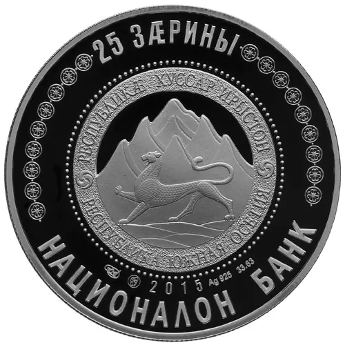 | Obverse lettering | 25 ЗÆРИНЫ РЕСПУБЛИКӔ ХУССАР ИРЫСТОН РЕСПУБЛИКА ЮЖНАЯ ОСЕТИЯ СПМД 2015 Ag 925 33,63 НАЦИОНАЛОН БАНК (Translation: 25 Zarin Republic of South Ossetia SPMD 2015 Ag 925 33,63 National Bank) |