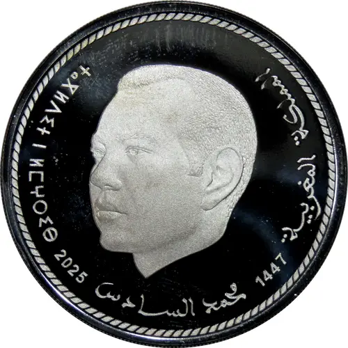 | Opis líce | ⵜⴰⴳⵍⴷⵉⵜ ⵏ ⵍⵎⵖⵔⵉⴱ المملكة المغربية 1447 محمد السادس 2025 (Translation: Kingdom of Morocco 2025 Mohammed VI 1447 Kingdom of Morocco) |