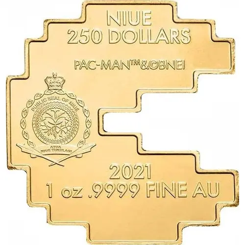| Obverse lettering | NIUE 250 DOLLARS PAC-MAN™& ©BNEI PUBLIC SEAL OF NIUE ATUA NIUE TUKULAGI 2021 1 oz .9999 FINE AU |