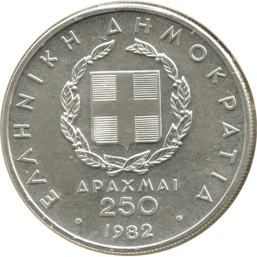 | نوشتههای روی سکه | ΕΛΛΗΝΙΚΗ ΔΗΜΟΚΡΑΤΙΑ ΔΡΑΧΜΑΙ 250 1982 |