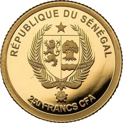 RÉPUBLIQUE DU SÉNÉGAL UN PEUPLE UN BUT UNE FOI 250 FRANCS CFA (Translation: Republic of Senegal One Nation, One Goal, One Faith) |