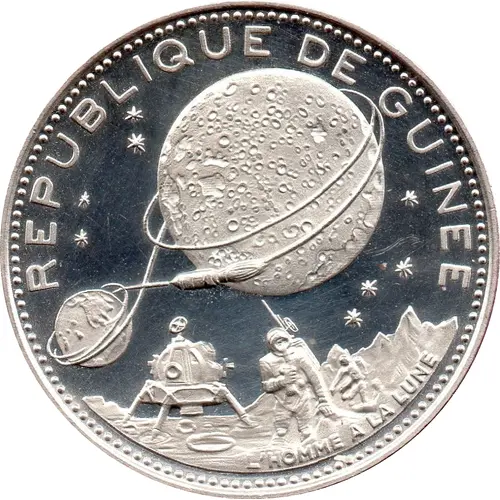 Historical Context: Issued by the Republic of Guinea between 1969 and 1970, this 250 Francs Guinéens coin commemorates one of humanity's most significant achievements: the Apollo 11 lunar landing. Under the presidency of Ahmed Sékou Touré, Guinea, a newly independent nation with a strong socialist orientation, seized this opportunity to align itself with global scientific progress and human endeavor. The rapid issuance of this commemorative piece underscores Guinea's desire to participate in celebrating this monumental event, projecting an image of modernity and forward-thinking amidst the Cold War era and post-colonial nation-building efforts.