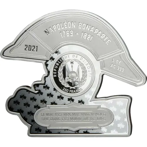 NAPOLEON BONAPARTE 1769 - 1821 2021 5 OZ AG 999 REPUBLIQUE DE DJIBOUTI 250 FRANCS LA MORT N`EST RIEN, MAIS VIVRE VAINCU ET SANS GLOIRE, C`EST MOURIR TOUS LES JOURS (Translation: Republic of Djibouti Death is nothing, but living defeated and without glory is dying every day) |