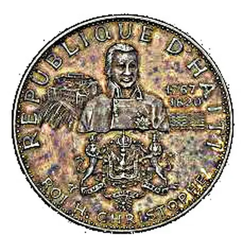 | Obverse lettering | REPUBLIQUE D`HAÏTI 1767 1820 ROI H. CHRISTOPHE (Translation: Republic of Haiti 1767 1820 King H[enri]. Christophe) |