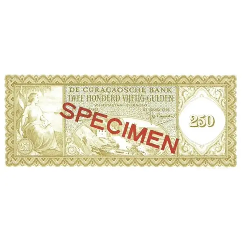 Obverse lettering DE CURAÇAOSCHE BANK TWEE HONDERD VIJFTIG GULDEN WILLEMSTAD - CURAÇAO DE SECRETARIS DE VOORZITTER `SPECIMEN` JOH. ENSCHEDÉ EN ZONEN