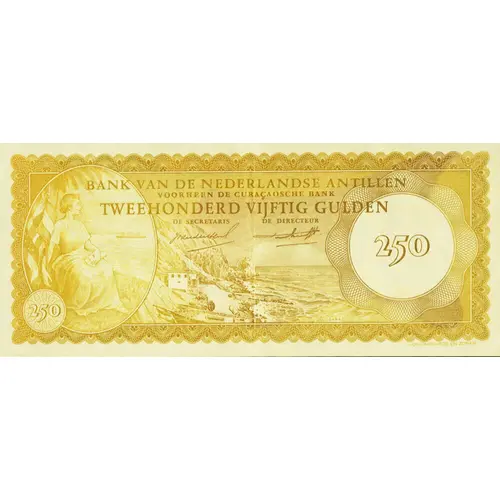 (Translation: Bank of Netherlands Antilles Former the Bank of Curaçao Two Hundred and Fifty Gulden Secretary Director Joh. Enschedé and Sons)