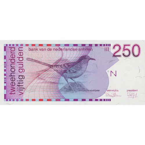 (Translation: Two Hundred and Fifty Gulden Bank of the Netherlands Antilles 250 Caribbean mockingbird)