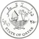 Emblem of Qatar consisting of two crossed bent swords, and between them a sailing ship (dhow) sailing on waves beside an island with two palm trees. Value in Arabic on the sides. |