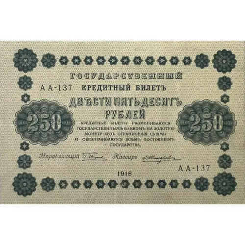 | Obverse lettering | Государственный кредитный билетъ Двѣсти пятьдесятъ рублей Кредитные билеты размѣниваются Государственнымъ Банкомъ на золотую монету безъ ограниченiя суммы и обезпечиваются всѣм достоянiемъ Государства Управляющiй Кассиръ 1918 (Translation: State credit note Two hundred and fifty Roubles Credit notes are exchanged by the state bank for gold coin without limitation of sum and are backed by government property Manager Cashier 1918) |