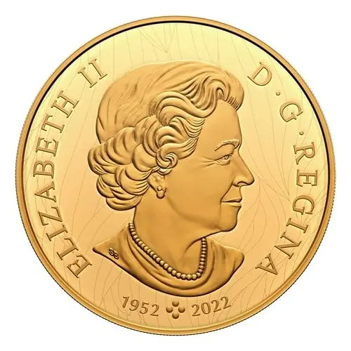 Head of Queen Elizabeth II, as at 77 years of age, bare headed, wearing necklace and earrings, facing right. Below, double dates “1952” and “2022”, separated by four pearls symbolizing the four effigies that have graced Canadian coins throughout her reign. Background is a nature-themed pattern. |