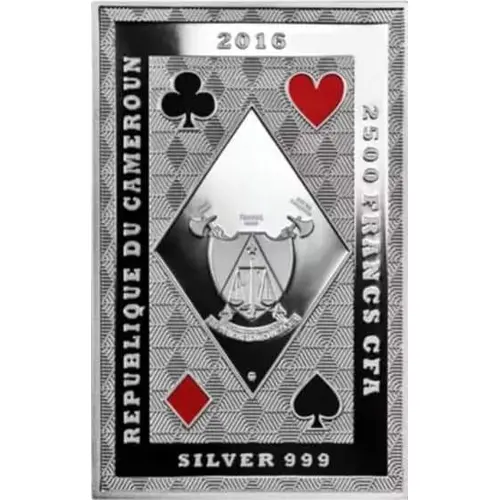 Coat of arms of Cameroon in rhombic frame at centre. Clubs, hearts, diamonds and spades in corners. |