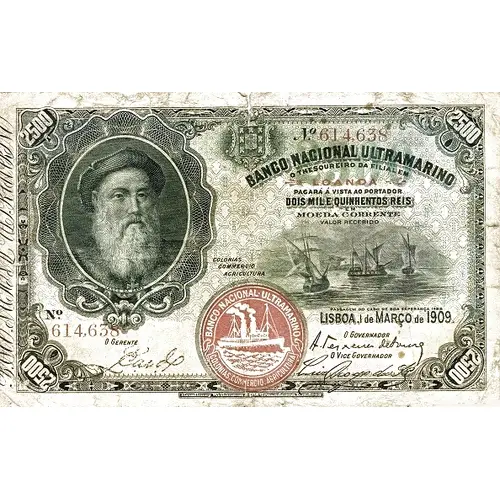 BANCO NACIONAL ULTRAMARINO O THESOUREIRO DA FILIAL EM LOANDA PAGARÁ Á VISTA AO PORTADOR DOIS MIL E QUINHENTOS REIS EM MOEDA CORRENTE VALOR RECEBIDO (Translation: National Overseas Bank, The Branch Treasurer in Luanda, Will pay the holder on sight two thousand five hundred réis in current currency) |