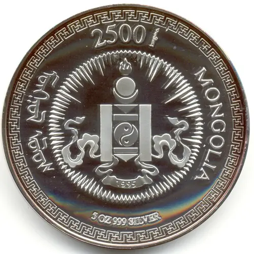 | Légende de l’avers | 2500 ᠲᠥᠭᠦᠷᠢᠭ᠌ ᠮᠤᠩᠭᠤᠯ ᠤᠯᠤᠰ MONGOLIA 1995 5 OZ 999 SILVER (Translation: 2500 Tugriks Monggol Ulus (Mongolia)) |