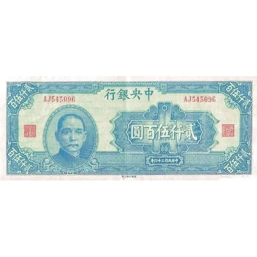 | Obverse lettering | 行銀央中 圓百伍仟貳 年四十三國民華中 (Translation: Central Bank of China Two Thousand Five Hundred Yuan Printed in the 34th year of the Republic) |
