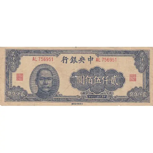 | Obverse lettering | 行銀央中 圓佰伍仟貳 年四十三國民華中 (Translation: Central Bank of China Two Thousand Five Hundred Yuan Printed in the 34th year of the Republic) |