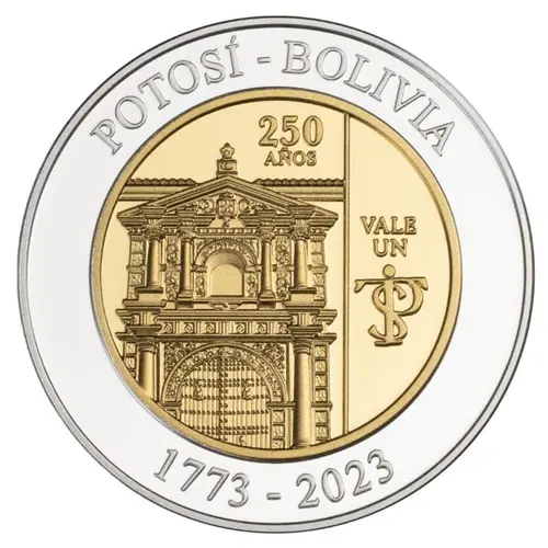 | Obverse lettering | POTOSÍ - BOLIVIA 250 AÑOS VALE UN 1773 - 2023 (Translation: Potosi - Bolivia 250 years Worth a) |