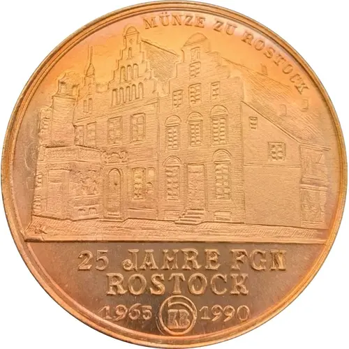 | Obverse lettering | MÜNZE ZU ROSTOCK 25 JAHRE FGN ROSTOCK 1965 1990 |