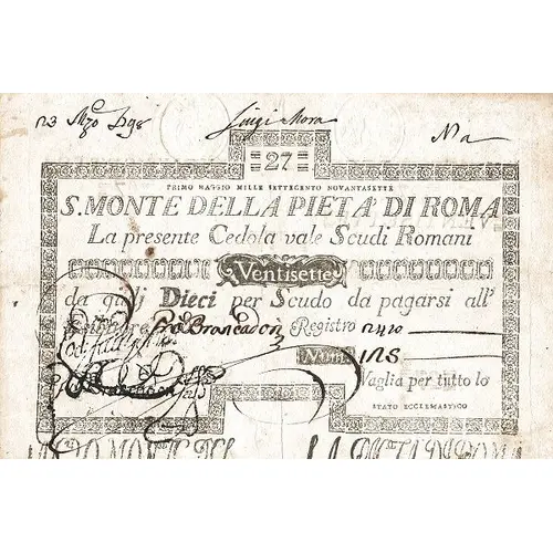 | نوشتههای روی اسکناس | 27 PRIMO MAGGIO MILLE SETTECENTO NOVANTASETTE S. M. DI PIETA DI ROMA La presente Cedola vaglia Scudi Romani Ventisette da giulj dieci per Scudo da pagarsi all` Esibitore. |