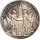 Two riflemen in national costume shake hands over the target and flags, with the Hermann Monument in the background. |