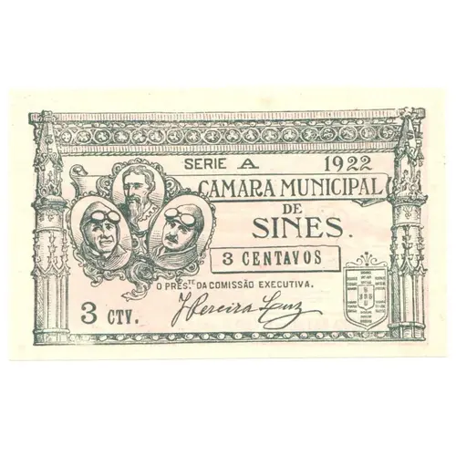 SERIE A 1922 CAMARA MUNICIPAL DE SINES 3 CENTAVOS (Translation: Series A 1922 Sines City Council 3 Cents) |