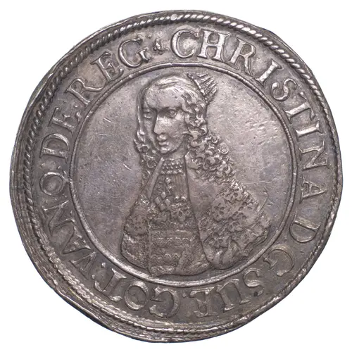 CHRISTINA · D : G : SUE : GOT : VAN : Q : DE : REG · (Translation: Christina Dei Gratia Sveciae Gothorum Vandalorumque Designata Regina Christina, with God`s grace, designated Queen of Sweden, the Goths, and the Wends) |