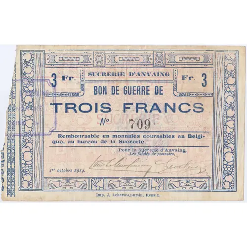 | Obverse lettering | SUCRERIE D`ANVAING BON DE GUERRE DE TROIS FRANCS N° 709 (entre deux lignes) Remboursable en monnaies coursables en Belgi- que, au bureau de la Sucrerie. Pour la Sucrerie d`Anvaing, Les fondés de pouvoirs, (deux signatures) 1er octobre 1914 Imp. J. Leherte-Courtin, Renaix. |