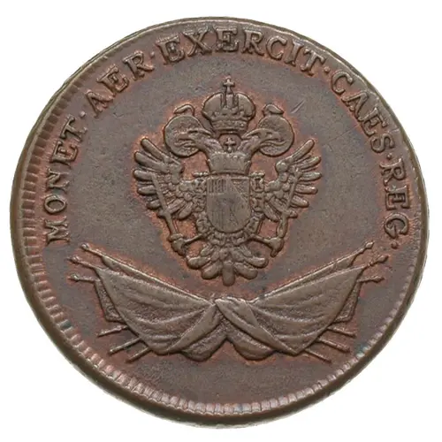 | Obverse description | Crowned double headed imperial eagle and Austrian coat of arms above crossed flags. Legend above for `Moneta Aerea Exercitus Caesarei Regii` |