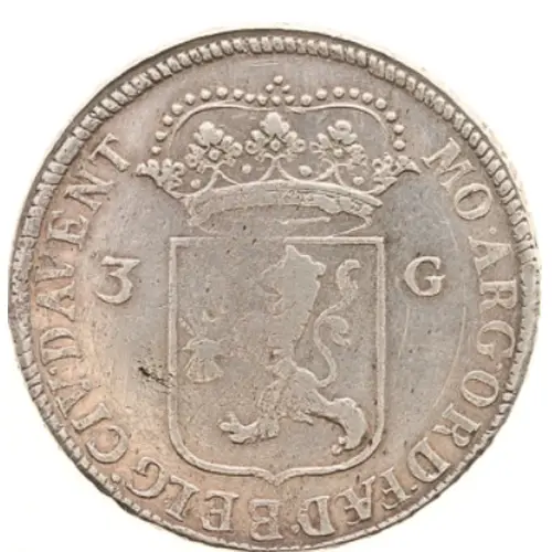 MO.ARG.ORD.FAD.BELG.CIV.DAVENT 3 G (Translation: Silver coinage of the United Provinces of the Netherlands, City of Deventer 3 Gulden) |