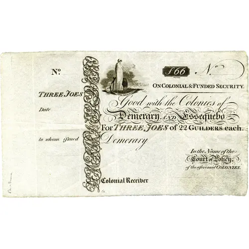 | Obverse lettering | THREE JOES Date to whom iſsued ON COLONIAL & FUNDED SECURITY. Good with the Colonies of Demerara AND Essequebo FOR THREE JOES of 22 GUILDERS each. Demerary In the Name of the Court of Policy of the aforesaid COLONIES Colonial Receiver |