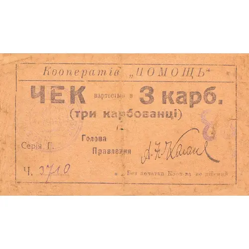 | Obverse lettering | (Translation: Cooperative `POMOSHCH` (`Help`) CHECK for 3 karbovantsiv (three karbovantsiv) Series G Chairman of the Board of Directors (signature) No. 3710 Not valid without the cooperative stamp) |