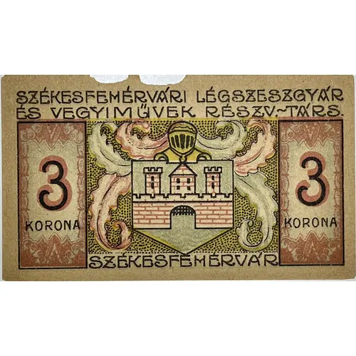 | Obverse lettering | SZÉKESFEHÉRVÁRI LÉGSZESZGYÁR ÉS VEGYIMŰVEK RÉSZV.TÁRS. 3 KORONA SZÉKESFEHÉRVÁR (Translation: SZÉKESFEHÉRVÁR GAS AND CHEMICAL PLANT JOINT STOCK COMPANY 3 KORONA SZÉKESFEHÉRVÁR) |