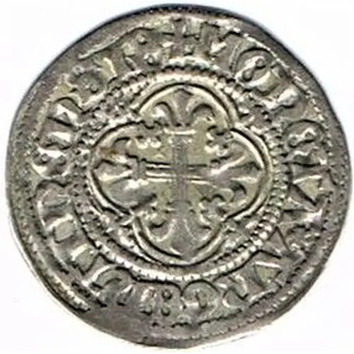 | 表面の説明 | Cross with fleur-de-lis within a four-lobed frame, decorated inside with four small fleurs-de-lis, and foliage outside; frame separated from the legend by a pearl circle. |