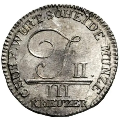 | Obverse lettering | CHURF. WURT. SCHEIDEMUNZE F.II. III KREUZER (Translation: Kurfürstentum Württemberg Scheidemünze) |