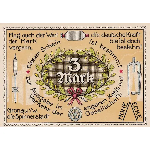 (Translation: Even if the value of the German power of the mark remains, it will remain! This bill is intended for issue in the narrower circle and in the company`s dealings. The weird town. High Corner) |