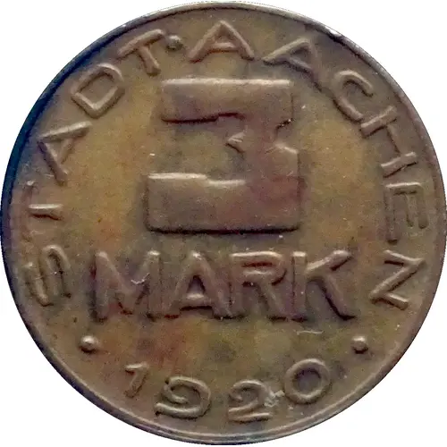 | Obverse lettering | STADT · AACHEN 3 MARK .1920. |
