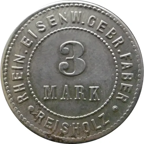 | Legenda del dritto | RHEIN. EISENW. GEBR. FABER 3 MARK ● REISHOLZ ● |