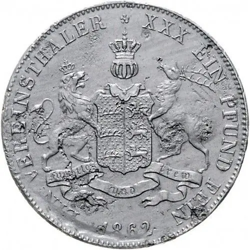 | Obverse lettering | EIN VEREINSTHALER XXX EIN PFUND FEIN furchtlos und trew 1862 |