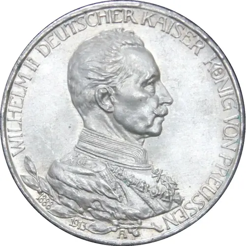 Historical Context: The 1913 3 Mark coin from the Kingdom of Prussia encapsulates the zenith of the German Empire under Kaiser Wilhelm II. Issued just prior to the outbreak of World War I, this coin reflects a period of intense industrialization, militarization, and imperial ambition. Wilhelm II, reigning since 1888, personified the era's blend of traditional monarchy and modern power, with Prussia as the dominant state within the unified German Empire. This denomination served as a significant silver circulating medium, widely used across the constituent states, symbolizing the Empire's economic and political strength at its peak.