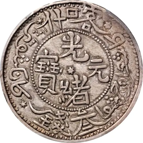 什喀 كاشنو ب - وج مثقال ١٣٢٣ 光 寶元 緒 錢叁 (Translation: Kashgar 3 Mithqual 1323 / Kashgar Mint Guangxu (Emperor) / Yuanbao (Original currency) 3 Qian) |