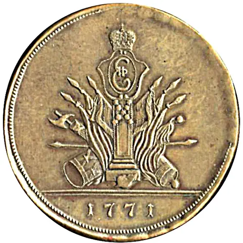 | Descrizione del dritto | Standing stone (similar to a gravestone) with two crossed bead strings at top. With a crowned `E` emblem standing for Ekaterina II. Then the stone is flanked by the flags from both principalities. And date at bottom. |