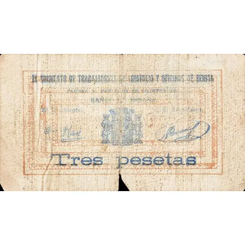EL SINDICATO DE TRABAJADORES DE COMERCIO Y OFICINAS DE BENISA PAGARÁ AL PORTADOR EN BILLETES DEL BANCO DE ESPAÑA Tres pesetas (Translation: The Commerce Workers Union and Offices of Benisa Will pay the bearer in banknotes from the Bank of Spain Three Pesetas) |