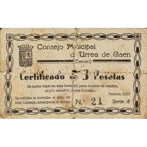 Consejo Municipal de Urrea de Gaen (Teruel) Certificado de 3 Pesetas de curso legal en esta localidad, para facilitar el cambio, según acuerdo de este Consejo. Su validez la acredita el sello de este Consejo, estampado al dorso. Emisión 1937 (Translation: Municipal Council of Urrea de Gaén (Teruel) 3 Pesetas certificate legal tender in this locality, to facilitate the change, according to the agreement of this Council. Its validity is confirmed by the seal of this Council, stamped on the back. Issue 1937) |