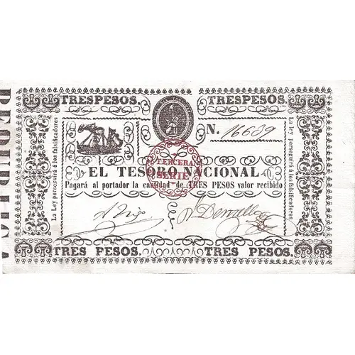 | Obverse lettering | 3 PESOS. 3 PESOS. REPUBLICA DEL PARAGUAY EL TESORO NACIONAL pagará al portador la cantidad de TRES PESOS valor recibido. La ley perseguirá á los falsificadores y sus cómplices. TERCERA SÉRIE (Translation: 3 Pesos Republic of Paraguay The National Treasury will pay to the bearer the amount of Three Pesos amount received. The law will prosecute counterfeiters and their accomplices. Third Series) |