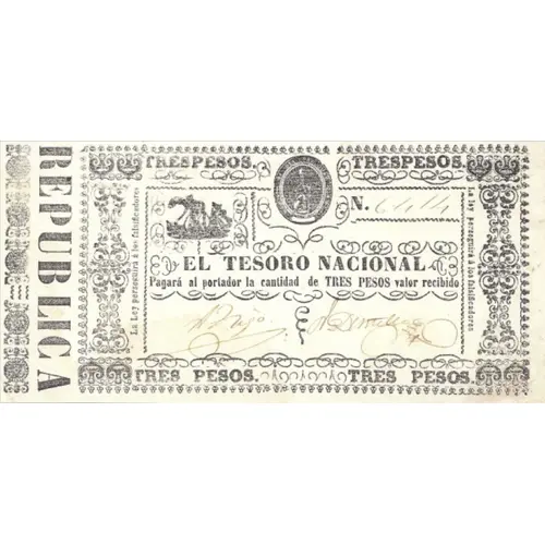 | Opis líce | REPUBLICA La ley perseguirá á los falsificadores y sus cómplices. TRES PESOS REPUBLICA DEL PARAGUAY EL TESORO NACIONAL pagará al portador la cantidad de TRES PESOS valor recibido. TRES PESOS. (Translation: Republic The law will prosecute counterfeiters and their accomplices. Three Pesos Republic of Paraguay The National Treasury will pay to the bearer the amount of Three Pesos received value. Three Pesos.) |