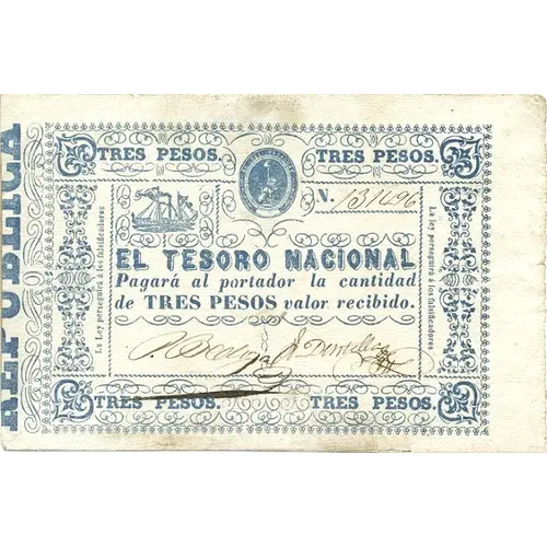 | Obverse lettering | TRES PESOS REPUBLICA DEL PARAGUAY EL TESORO NACIONAL Pagará al portador la cantidad de TRES PESOS valor recibido. La Ley perseguirá á los falsificadores. TRES PESOS (Translation: Three Pesos Republic of Paraguay The national Treasure will pay to the bearer the amount of Three Pesos, received value. The law will prosecute the counterfeiters.) |